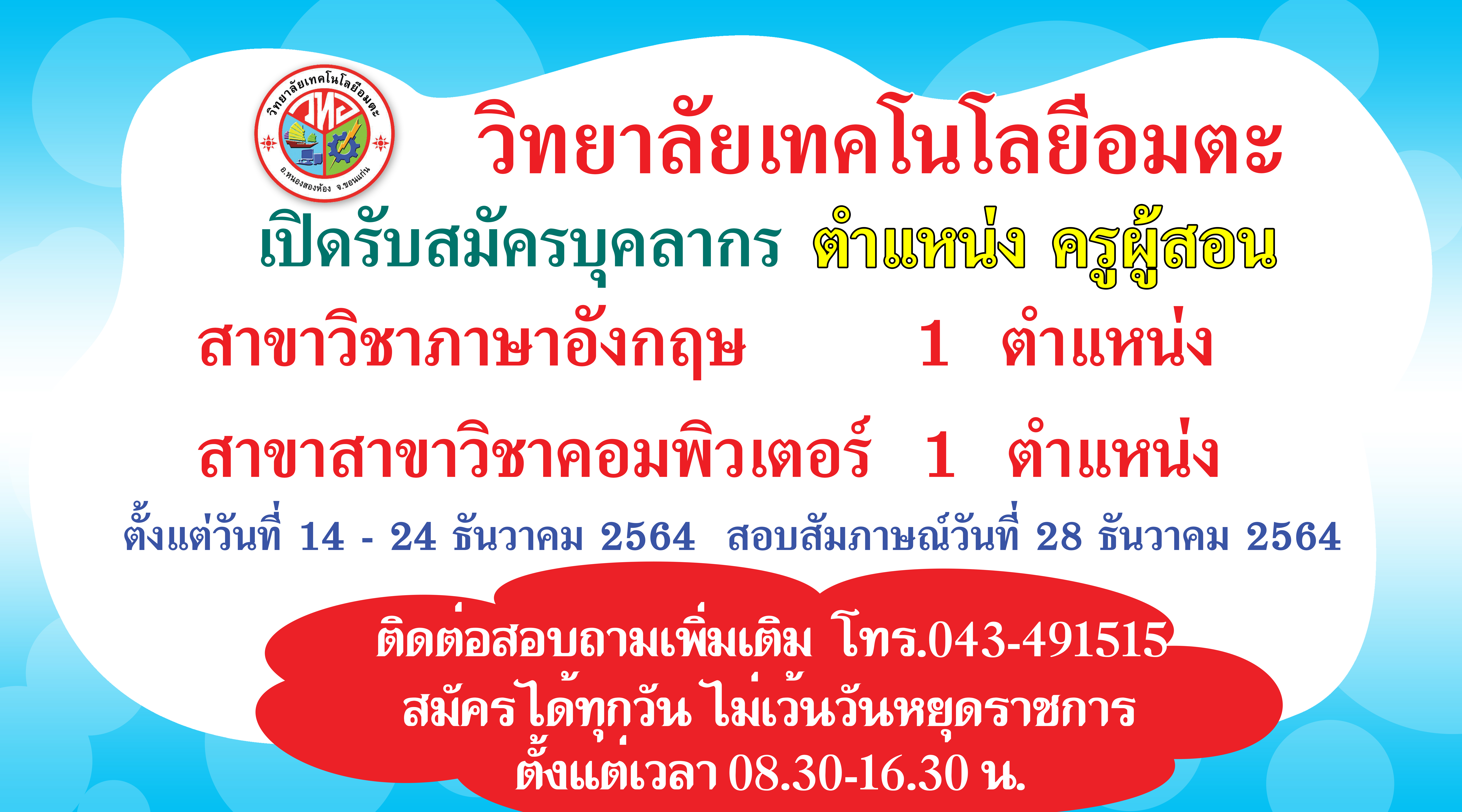 วิทยาลัยเทคโนโลยีอมตะ เปิดรับสมัครบุคลากรตำแหน่ง ครูผู้สอน รับสมัครบุคลากรตำแหน่ง ครูผู้สอนวิชาภาษาอังกฤษ 1 ตำแหน่ง ครูผู้สอนสาขาวิชาคอมพิวเตอร์ 1 ตำแหน่ง