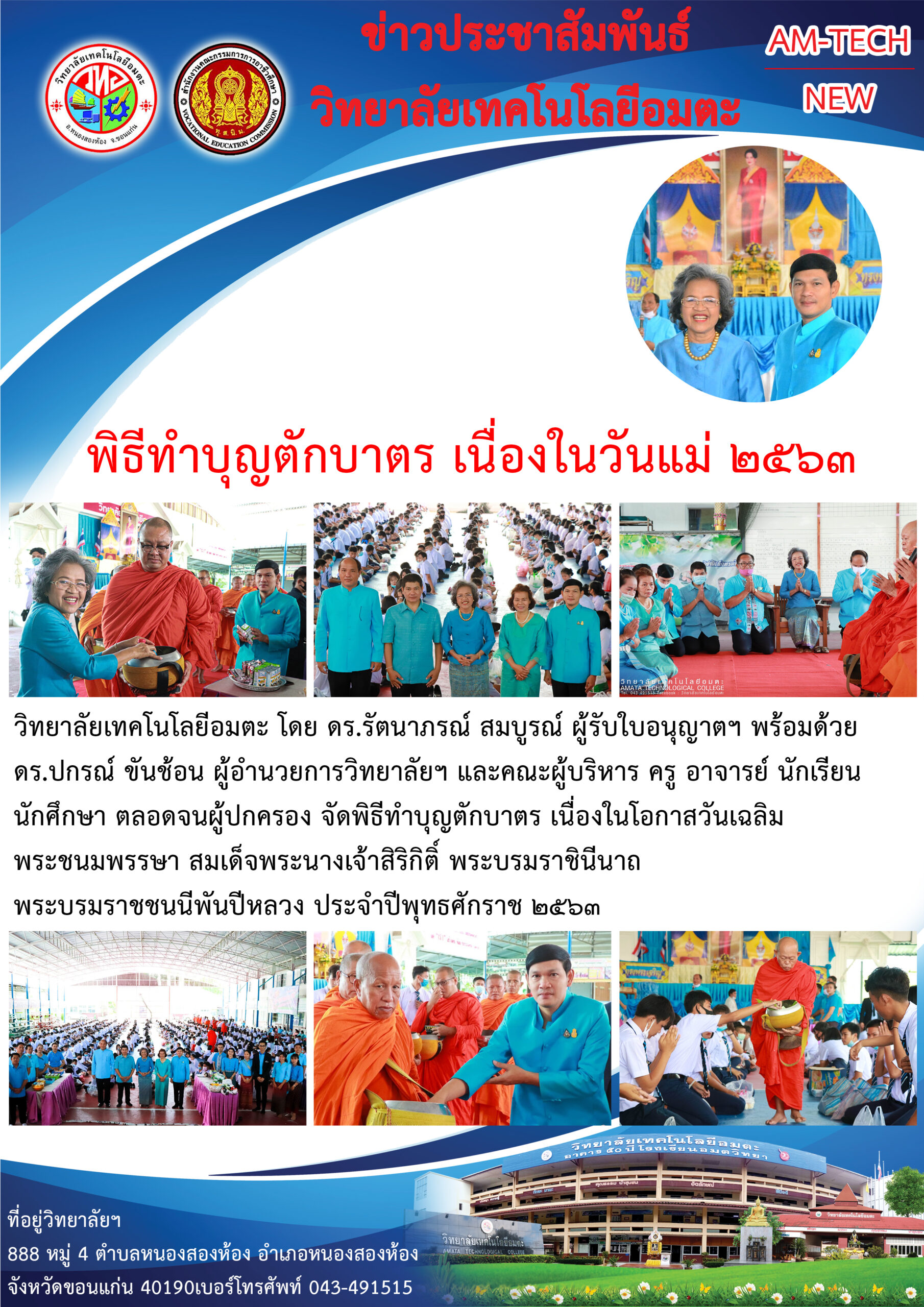 วิทยาลัยเทคโนโลยีอมตะ โดย ดร.รัตนาภรณ์ สมบูรณ์ ผู้รับใบอนุญาตฯ พร้อมด้วย ดร.ปกรณ์ ขันช้อน ผู้อำนวยการวิทยาลัยฯ และคณะผู้บริหาร ครู อาจารย์ นักเรียนนักศึกษา ตลอดจนผู้ปกครอง จัดพิธีทำบุญตักบาตร เนื่องในโอกาสวันเฉลิมพระชนมพรรษา สมเด็จพระนางเจ้าสิริกิติ์ พระบรมราชินีนาถ พระบรมราชชนนีพันปีหลวง ประจำปีพุทธศักราช ๒๕๖๓
