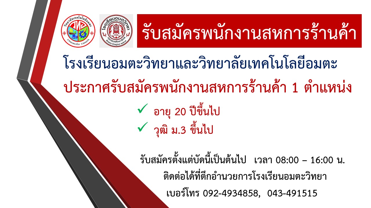 โรงเรียนอมตวิทยา และ วิทยาลัยเทคโนโลยีอมตะ เปิดรับสมัครพนักงานสหการร้านค้า เริ่มรับสมัครตั้งแต่วันนี้เป็นต้นไป ติดต่อสอบถามได้ที่ ตึกอำนวยการโรงเรียนอมตวิทยา โทร 092-4934858 และ 043-491515