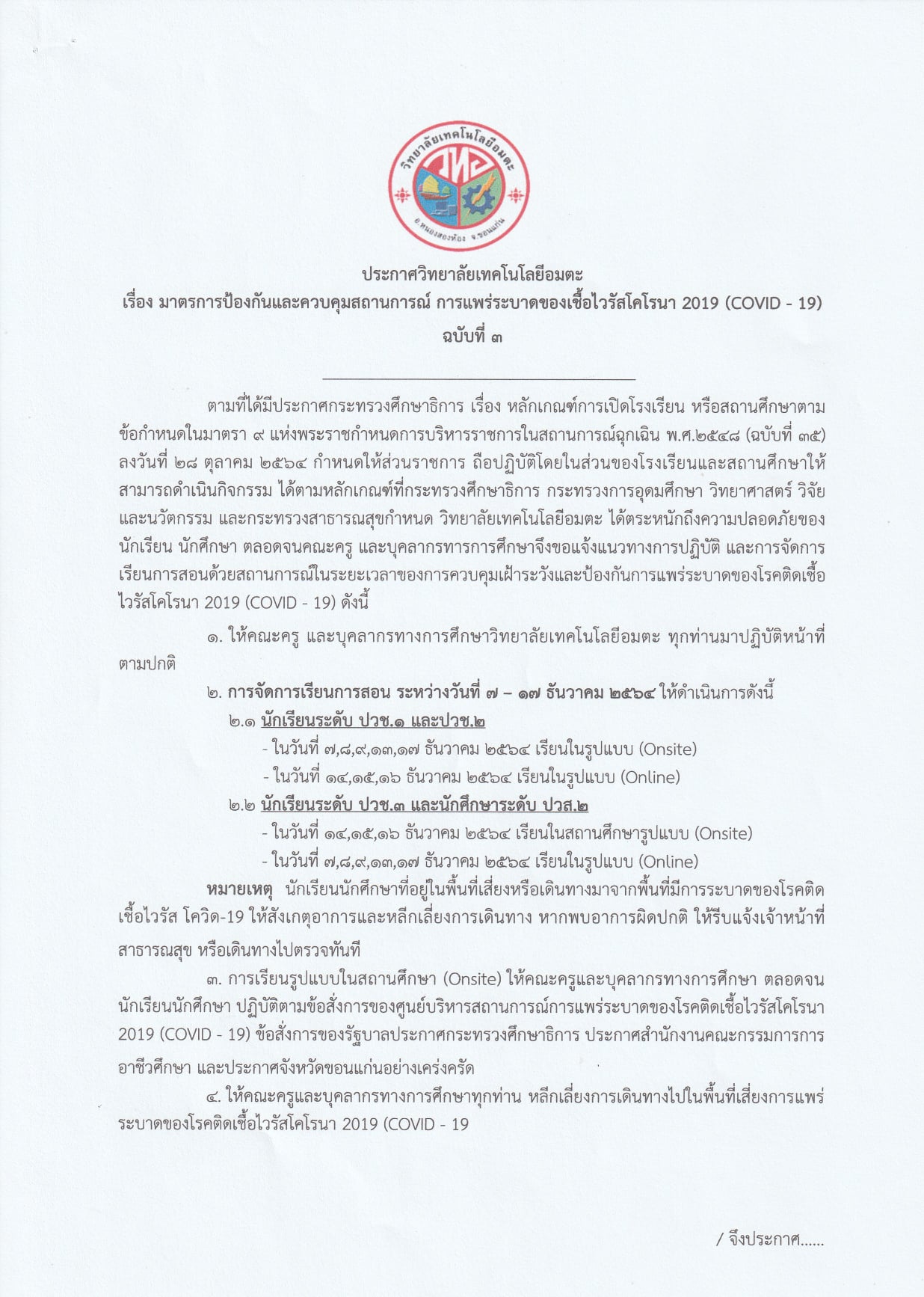 ประกาศวิทยาลัยเทคโนโลยีอมตะ เรื่องมาตรการป้องกันและควบคุมสถานการณ์ การแพร่ระบาดของเชื้อไวรัสโคโรนา 2019 (COVID – 19) ฉบับที่ 3 ทำการจัดการเรียนการสอน #ระหว่างวันที่7ถึงวันที่17ธันวาคม2564
