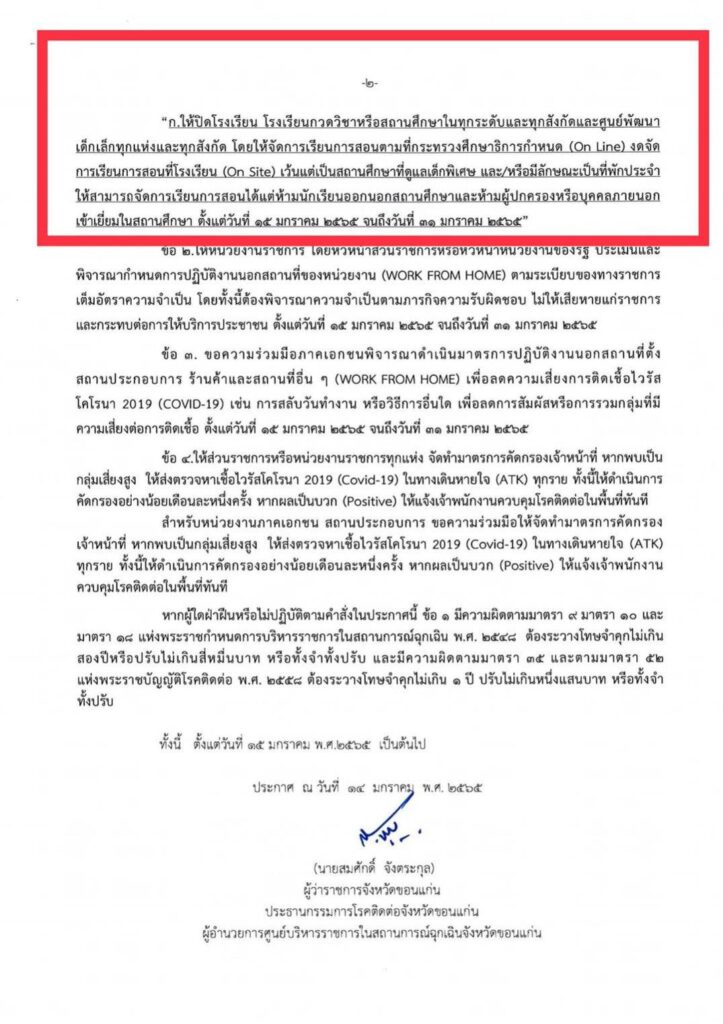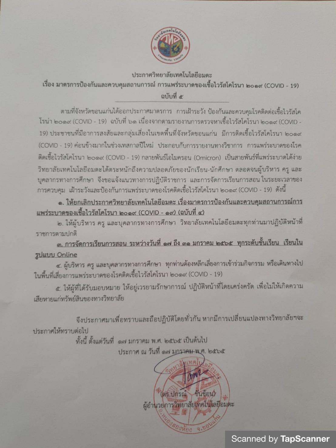 ประกาศวิทยาลัยเทคโนโลยีอมตะ เรื่อง มาตรการป้องกันและควบคุมสถานการณ์ การแพร่ระบาดของเชื้อไวรัสโคโรนา 2019 (COVID – 19) ตามที่จังหวัดขอนแก่นได้ออกประกาศมาตรการ การเฝ้าระวัง ป้องกันและควบคุมโรคติดต่อเชื้อไวรัสโคโรน่า 2019 (COVID – 19) ฉบับที่ 61 การจัดการเรียนการสอน ระหว่างวันที่ 17 ถึง 31 มกราคม 2565 ทุกระดับชั้นเรียน เรียนในรูปแบบ Online#เรียนในรูปแบบ Online 100%