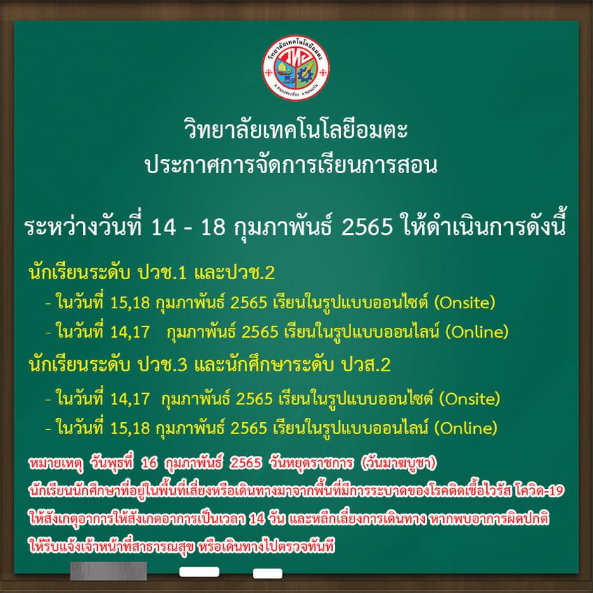วิทยาลัยเทคโนโลยีอมตะ ประกาศการจัดการเรียนการสอน ระหว่างวันที่ 14 – 18 กุมภาพันธ์ 2565 ให้นักเรียนระดับ ปวช.1-3 และนักศึกษาระดับ ปวส.2 ดำเนินการดังนี้