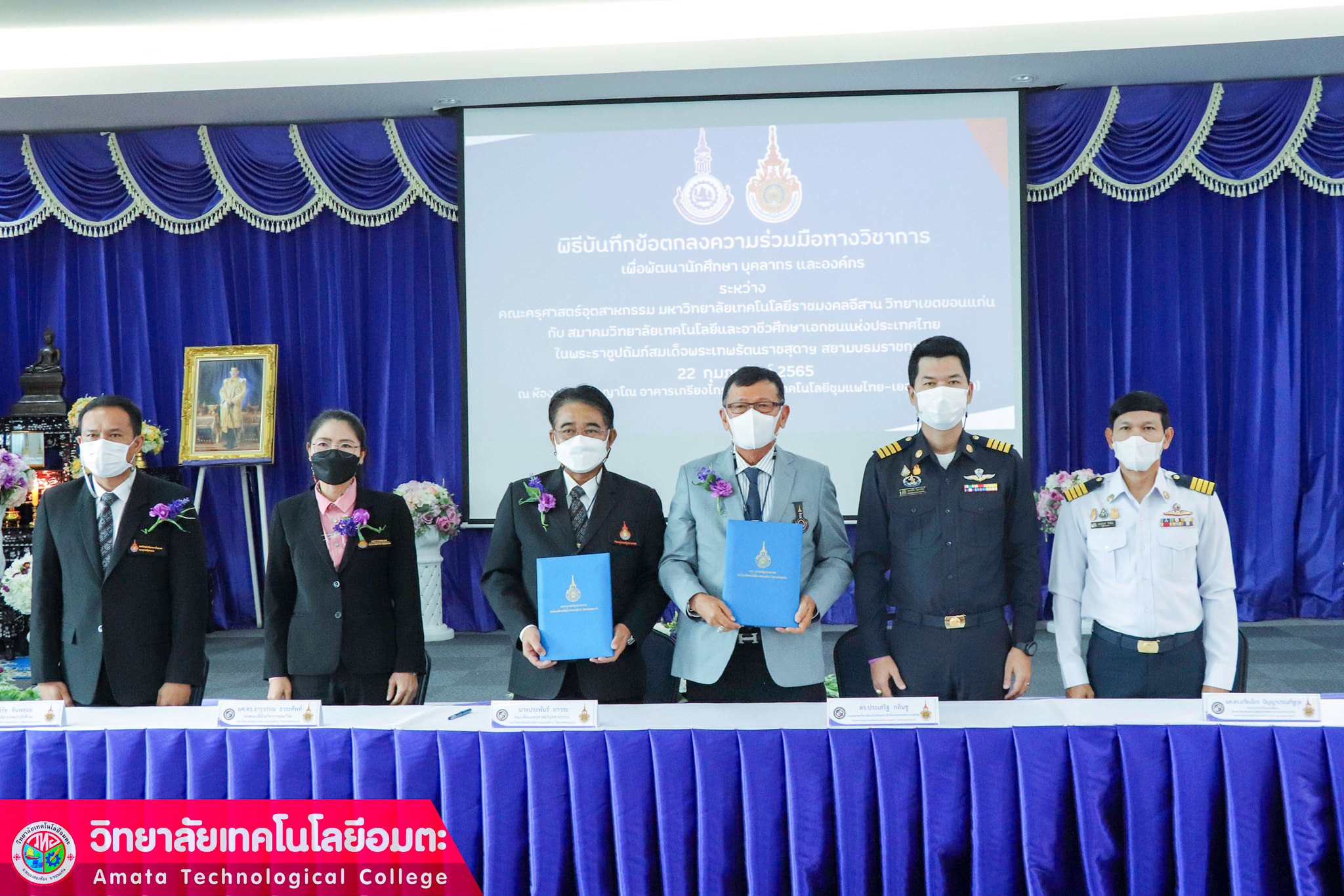 วัน อังคาร ที่ 23 กุมภาพันธ์ 2565 วิทยาลัยเทคโนโลยีอมตะ โดย ดร.ปกรณ์ ขันช้อน ผู้อำนวยการวิทยาลัยฯ ได้เข้าร่วมบันทึกข้อตกลงความร่วมมือทางวิชาการ เพื่อพัฒนานักศึกษา บุคลากรและองค์กร ระหว่าง คณะครุศาสตร์อุตสาหกรรม มหาวิทยาลัยเทคโนโลยีราชมงคลอีสาน วิทยาเขตขอนแก่น กับสมาคมวิทยาลัยเทคโนโลยีและอาชีวศึกษาเอกชนแห่งประเทศไทยในพระราชูปถัมภ์ สมเด็จพระเทพรัตนราชสุดาฯ สยามบรมราชกุมารี ณ ห้องประชุมวีรญาโณ อาคารเกรียงไกรวิทยาลัยเทคโนโลยีชุมแพไทย-เยอรมัน (จี-เทค)
