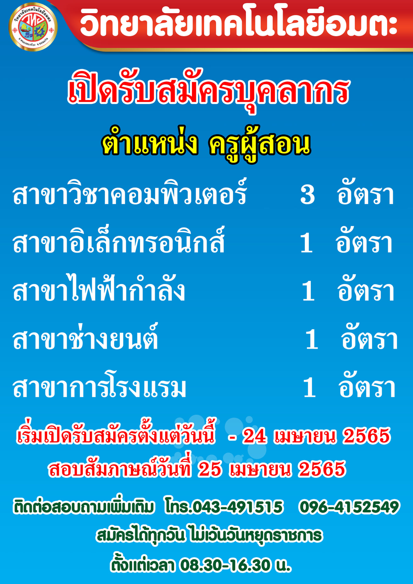 สอบสัมภาษณ์วันที่ 25 เมษายน 2565 ติดต่อสอบถามเพิ่มเติม โทร.043-491515 096-4152549