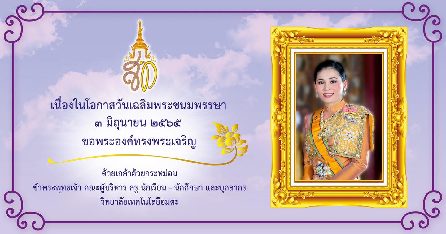 เนื่องในโอกาสวันคล้าย วันเฉลิมพระชนมพรรษาสมเด็จพระนางเจ้าสุทิดา พัชรสุธาพิมลลักษณ พระบรมราชินี 3 มิถุนายน 2565 ขอพระองค์ทรงพระเจริญ ด้วยเกล้าด้วยกระหม่อม ขอเดชะ ข้าพระพุทธเจ้า คณะผู้บริหาร ครู อาจารย์ นักเรียนนักศึกษา และบุคลากร วิทยาลัยเทคโนโลยีอมตะ