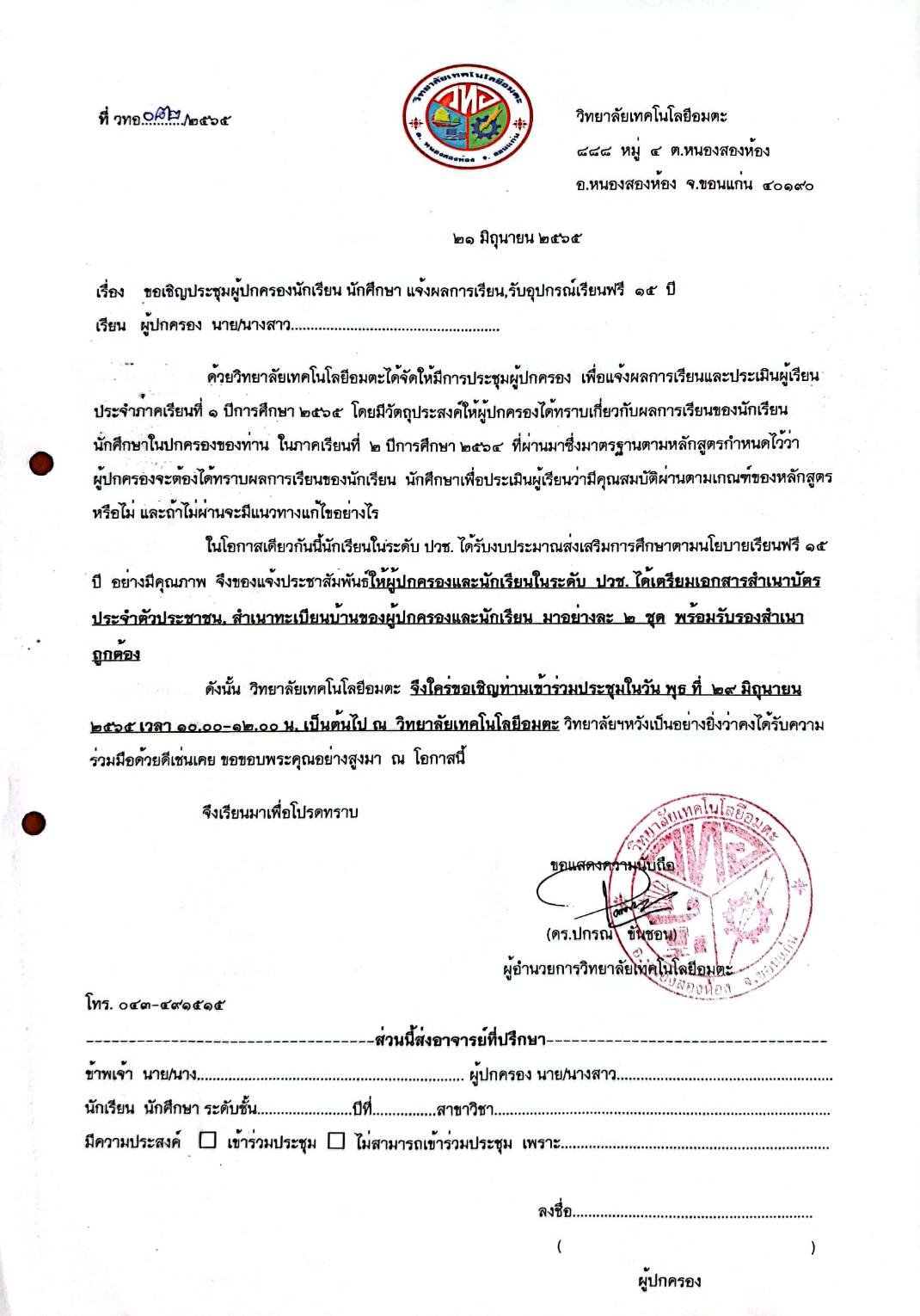 วิทยาลัยเทคโนโลยีอมตะ ได้จัดประชุมผู้ปกครองขึ้น ในวันที่ 29 มิถุนายน 2565 เพื่อแจ้งผลการเรียนและ รับอุปกรณ์เรียนฟรี 15 ปี
